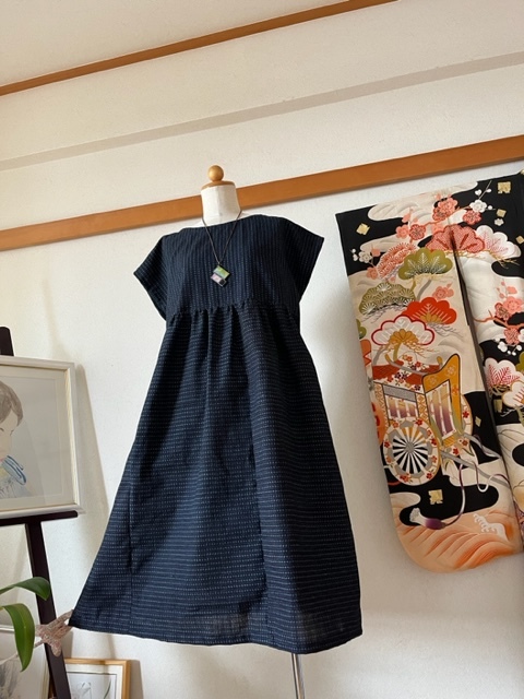 4693/美品~久留米絣/書生絣でフレンチスリーブでウエストギャザーのワンピースL~LL♪/涼しいです~素敵です~♪ 久留米絣 風のおくりもの | 久留米絣専門店公式 オンラインショップ