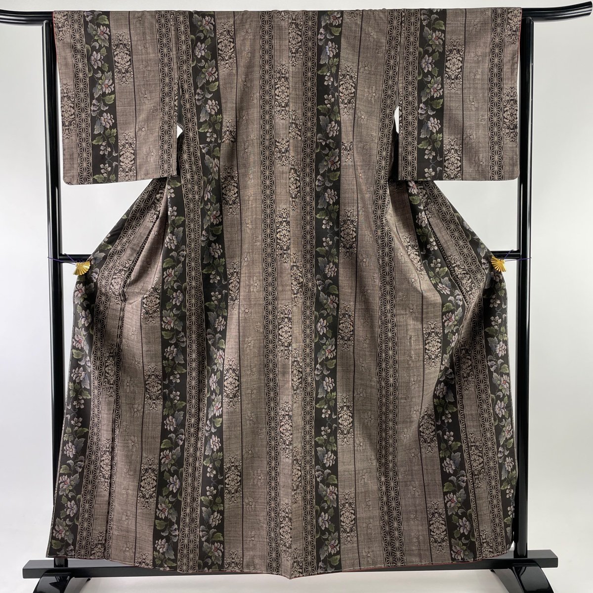 | 商品の特徴 | 大島紬 身丈154cm 裄丈67cm M 袷 純泥染 証紙 麻の葉 焦茶色 正絹 | ||