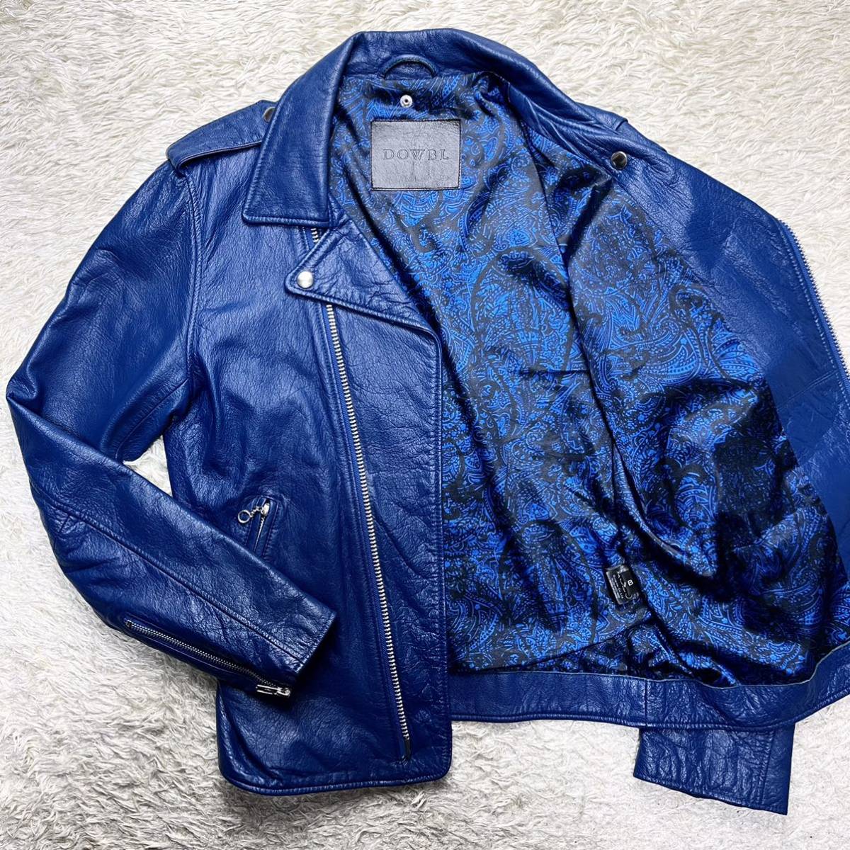 【大人の色気】DOWBL ダブル 山羊革 ゴートスキン ライダースジャケット レザー ブルゾン ブルー 裏地総柄 Mo-Laws 山羊革 メンズ シングルライダースジャケット ダメージカラー