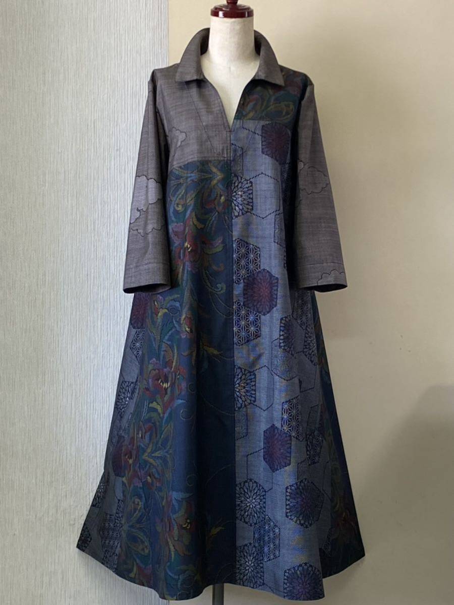 着物リメイク★正絹★大島紬いろいろパッチワーク★七分袖、シャツカラー、ロングフレアーワンピース 着物リメイク パッチワーク大島紬 縞ジコートチュニックワンピース つぎはぎ 羽織の検索結果